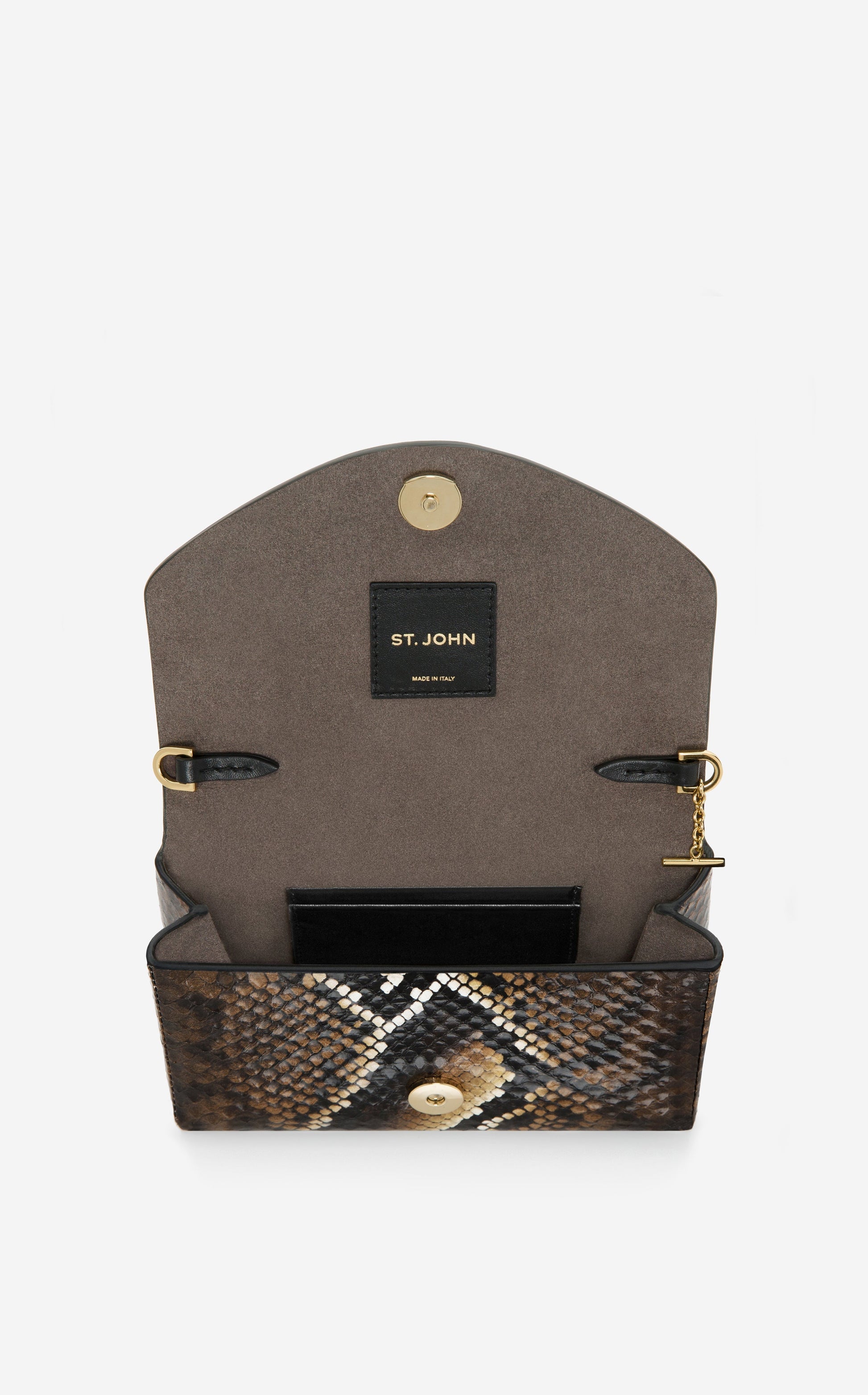 Mini Loop watersnake handbag with front flap, metal loop detail and removable chain strap. Lend a luxe note to your everyday with this mini version of our Loop leather handbag. Elegant snake patterning and the gleaming metal loop detail create a sumptuous contrast.