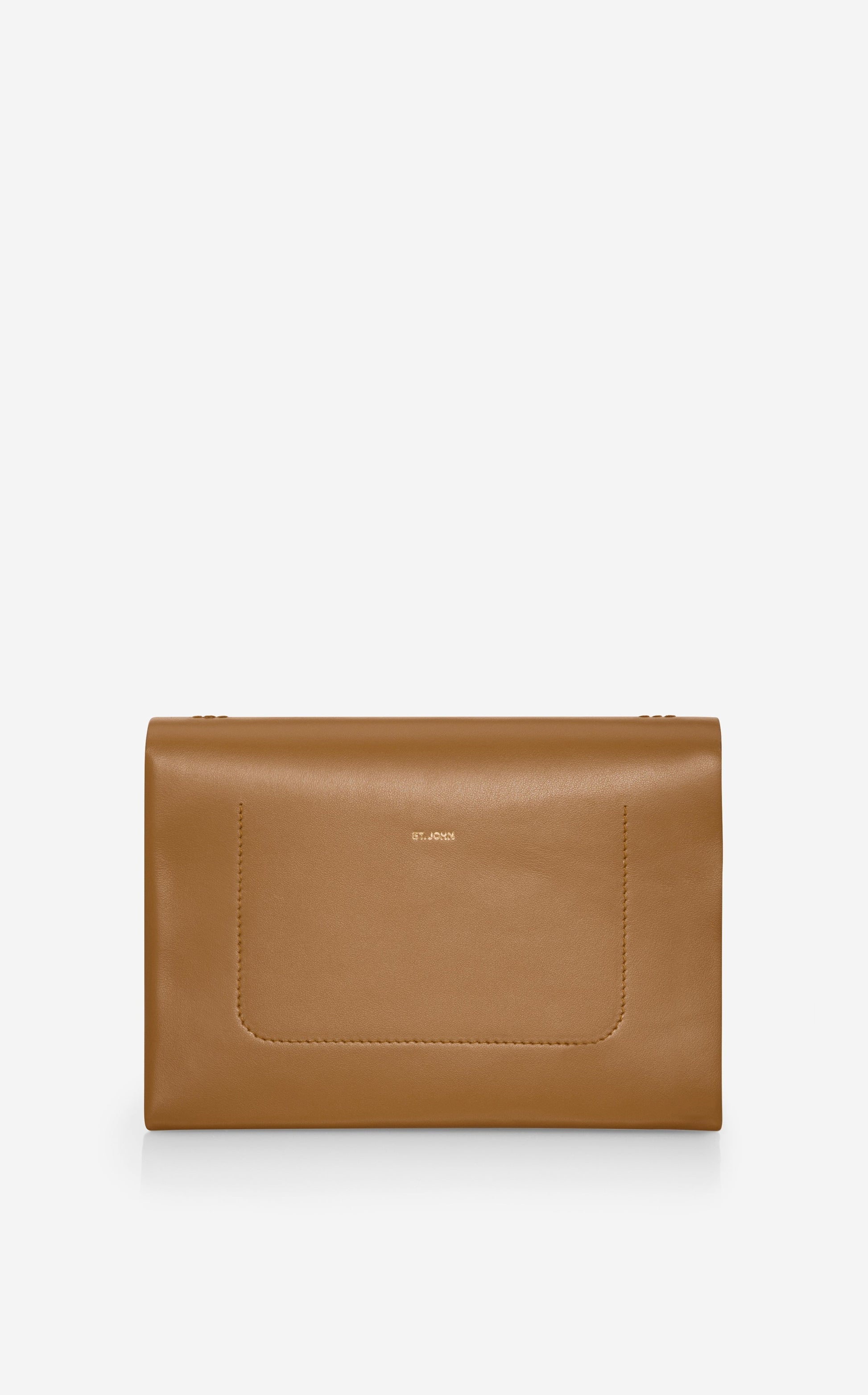A lovely camel leather handbag will go with everything. Featuring signature St. John loop hardware, leather and chain straps.