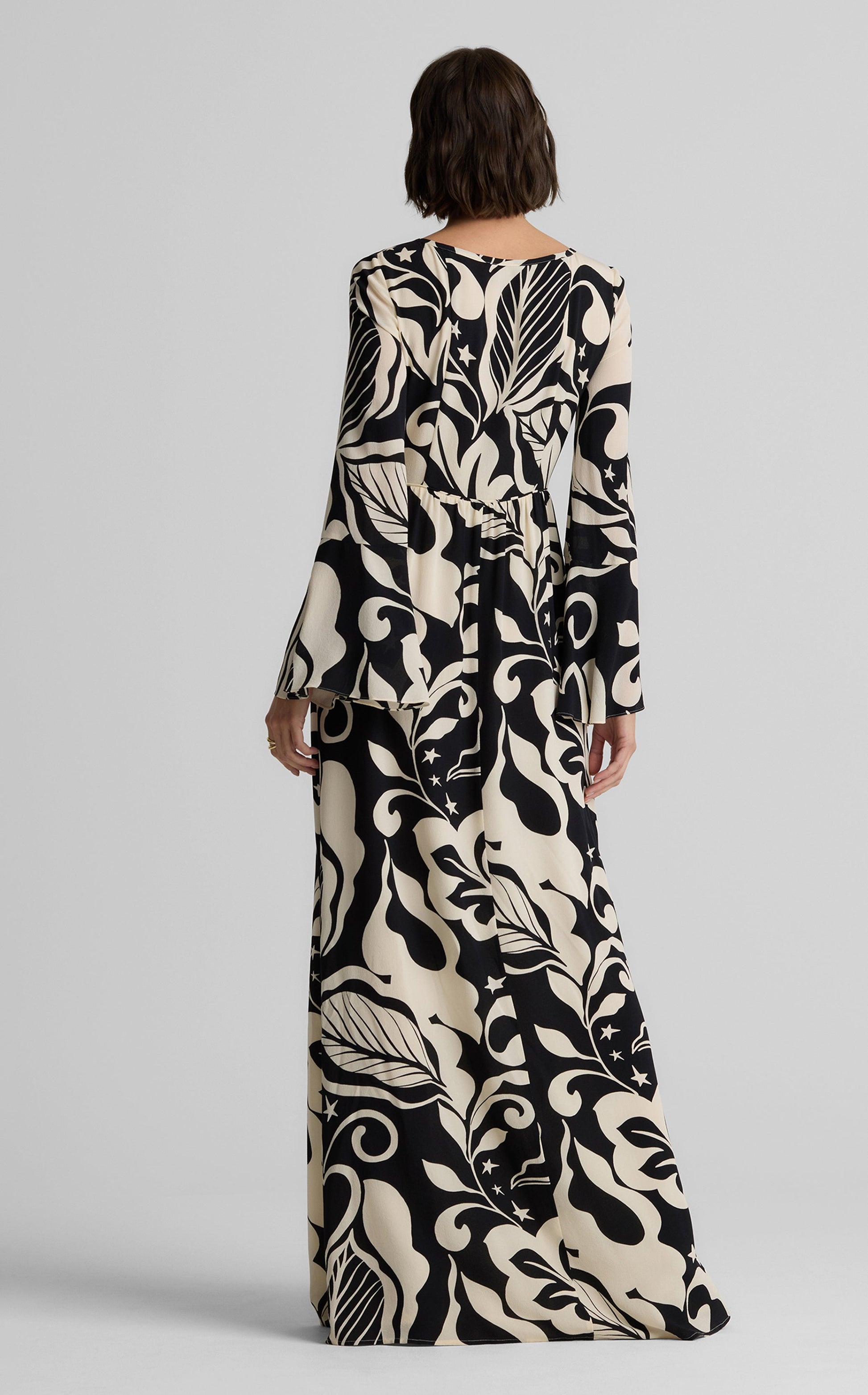 The ‘70s maxi is reimagined for modern women through this breezy yet bold dress that’s a dream for luxurious vacations, coastal dinner parties, and other occasions that call for laid-back glamour. With its graphic leaf print, flared sleeves, and delicate rhinestone accents, the Harlow combines retro charm and contemporary refinement to make a striking statement wherever it goes.