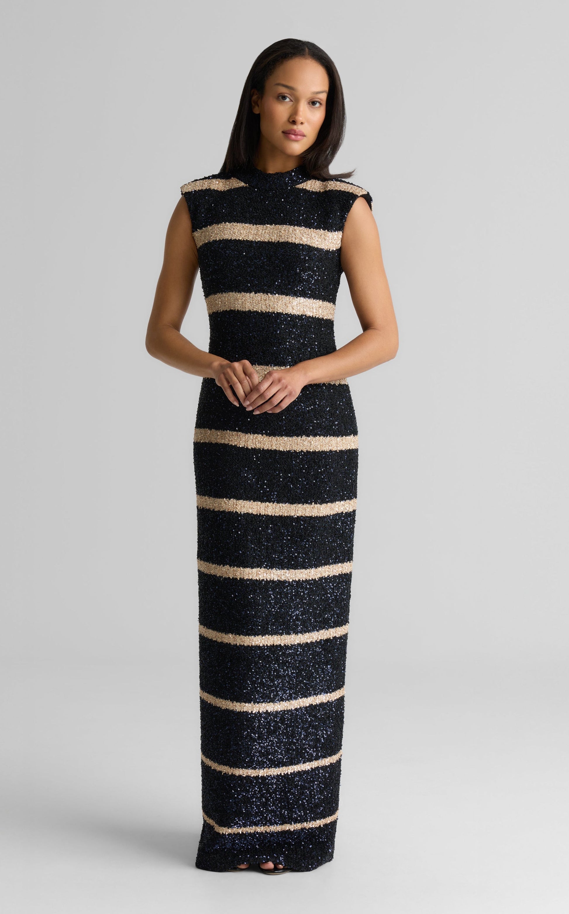 The Gina brings a fresh sense of drama to evening wear courtesy of its clever design details. Crafted in our glimmering sequin knit and featuring artfully fading Breton stripes along its sleek, form fitting silhouette, this glamorous gown is a bold reinterpretation of classic Parisian elegance. .