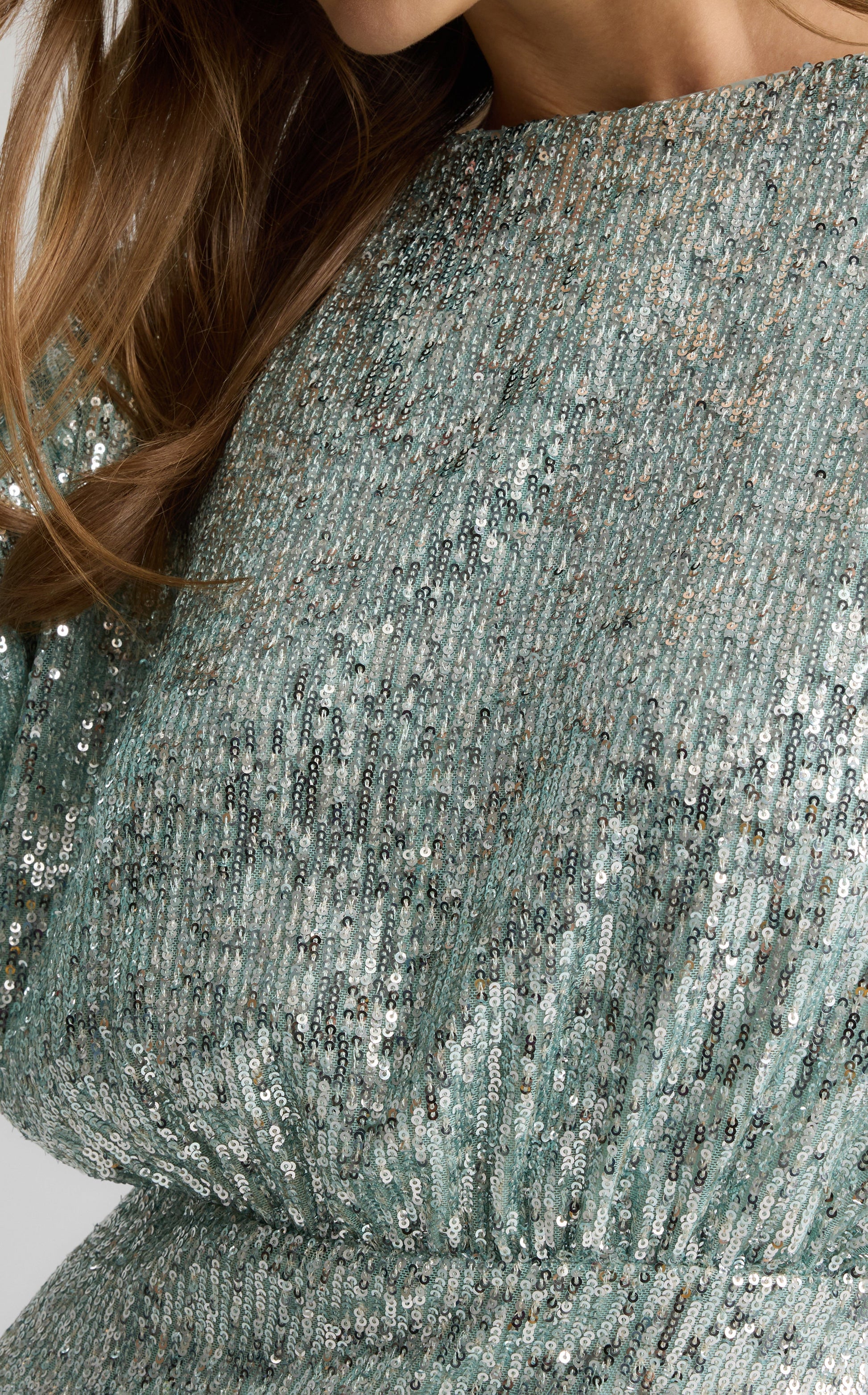 Radiant and refined, the Emmy was designed to take the spotlight. Stretch paillette offers maximum shine as well as ease of movement, while the open back is a restrained yet dramatic reveal that gives this gown its elegant appeal.