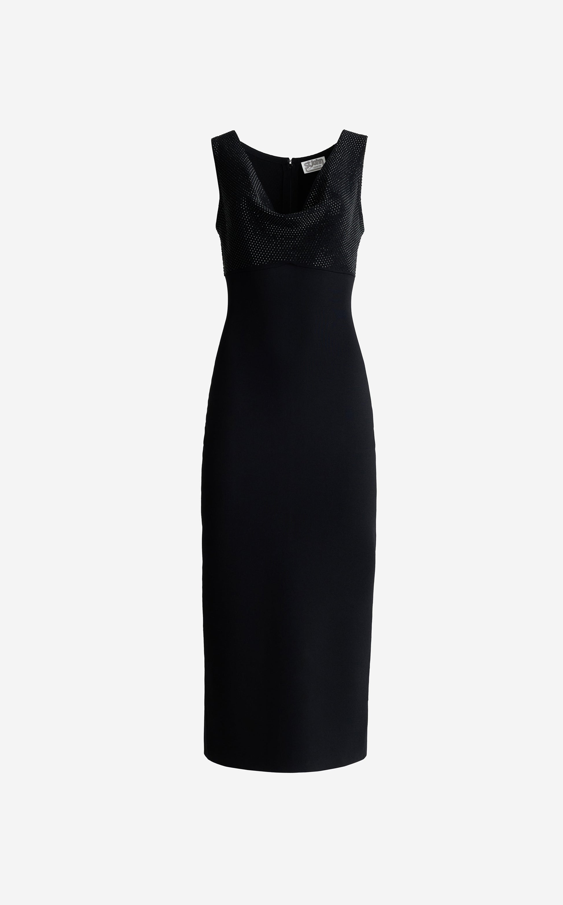 An updated take on an archival favorite, the Victoria exemplifies timeless elegance. Our signature Santa Roma Knit in a form fitting silhouette creates a polished look that moves with ease while embellished pave detail and a cowl neckline takes this dress from subtle to statement-making.