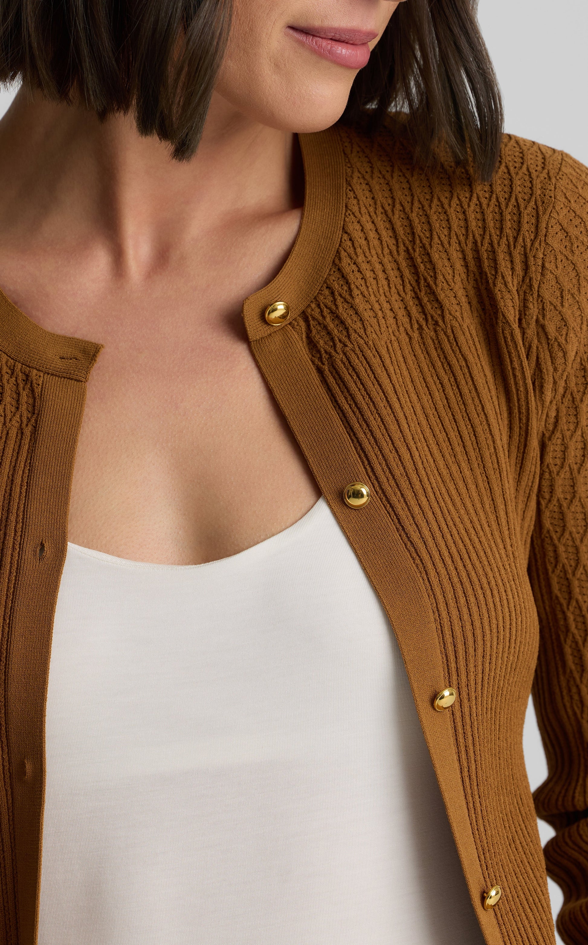 The River’s slim fit and delicately ribbed texture gives the classic cardigan an elevated update. Made from our Fine Mixed Knit and subtly embellished with gold buttons, this luxurious layering piece in rich Cinnamon pairs perfectly with the Wren Shell to create a coordinated twin set, but can also be mixed and matched with other tees and camisoles for endless possibilities.