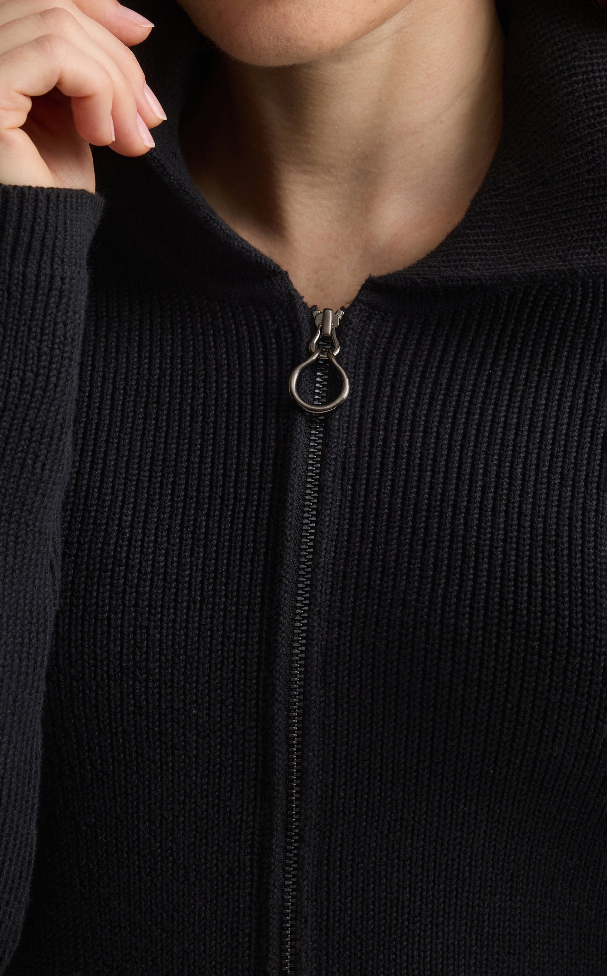 Sleek, sporty style gets an elevated update with this comfortable and chic layering essential. The Jasmine is cut from a soft, flexible ribbed knit in classic Black with a slightly boxy silhouette for a laid-back feel, while the gold zipper adds a level of luxury.
