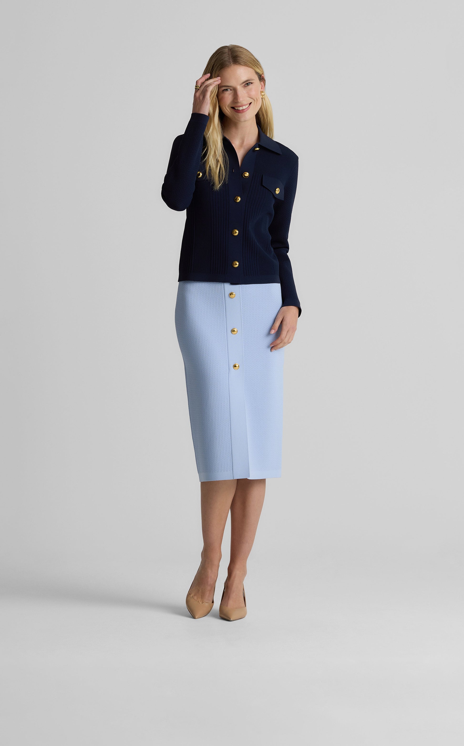 Worn on its own or layered over shells and tees, the Ellis instantly adds sophistication to any ensemble with its bold gold buttons and decorative flap pockets. Our comfortable and lightweight Madison Knit gives this delicately ribbed jacket both ease and polish as you move effortlessly through workdays and weekends alike.