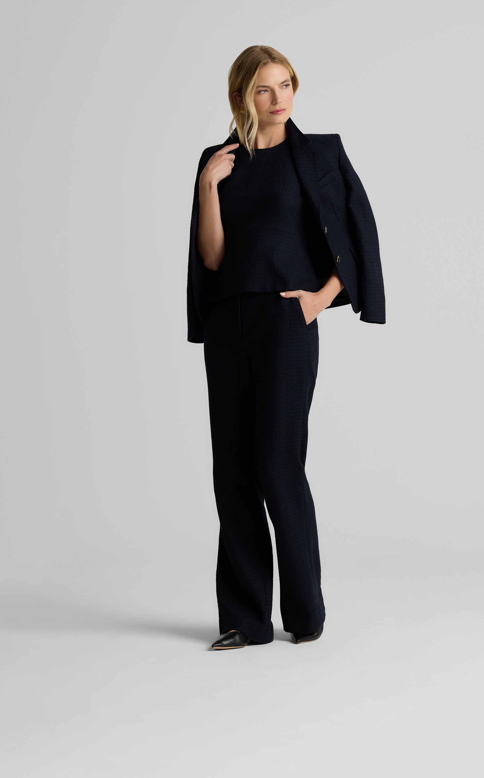 Crafted from our timeless Stretch Houndstooth in a classic Black/Navy palette, the Parker Jacket honors the heritage pattern’s past while giving it a modern update. With its expertly tailored silhouette, this jacket is an instantly iconic wardrobe addition that pairs with our Logan Pant for the chicest suit.