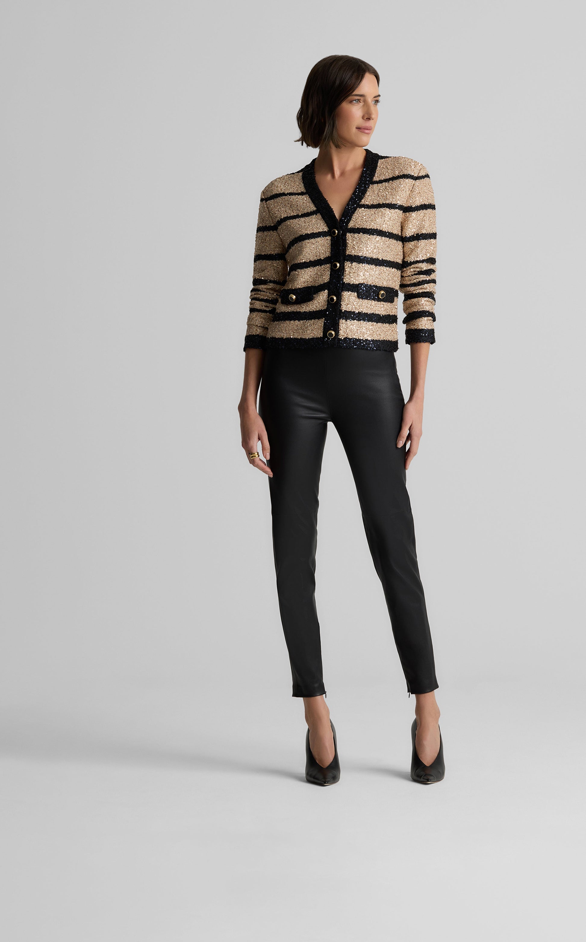 Shimmering sequins and a gradient Breton stripe give the Jolene its standout appeal. In addition to its dazzle, this tailored jacket possesses enough classic details—including a graceful V-neckline and black and gold decorative buttons—to make it a versatile piece in your formal wear collection. Pair it with our Bonnie Skirt for a spotlight-worthy matching set.