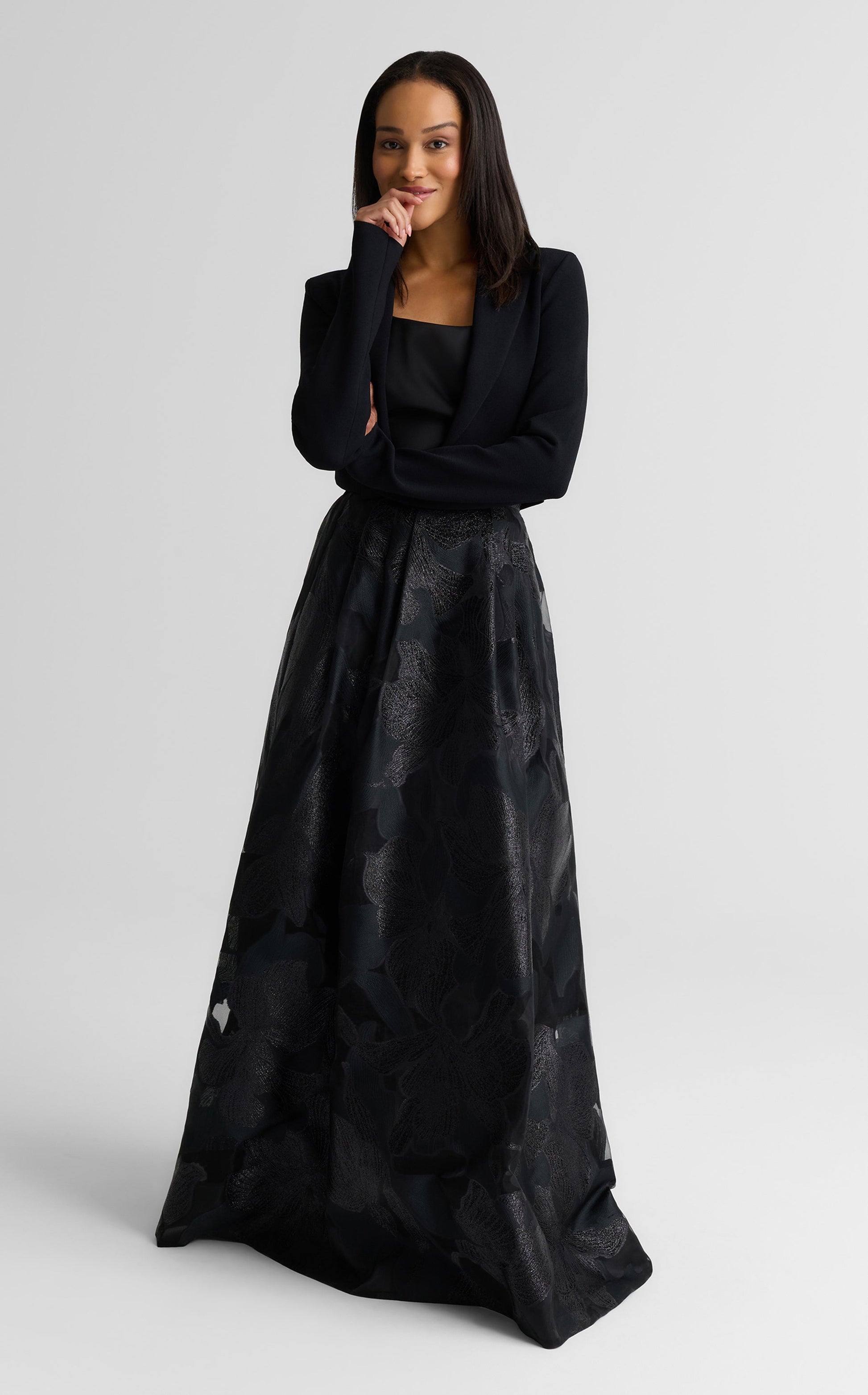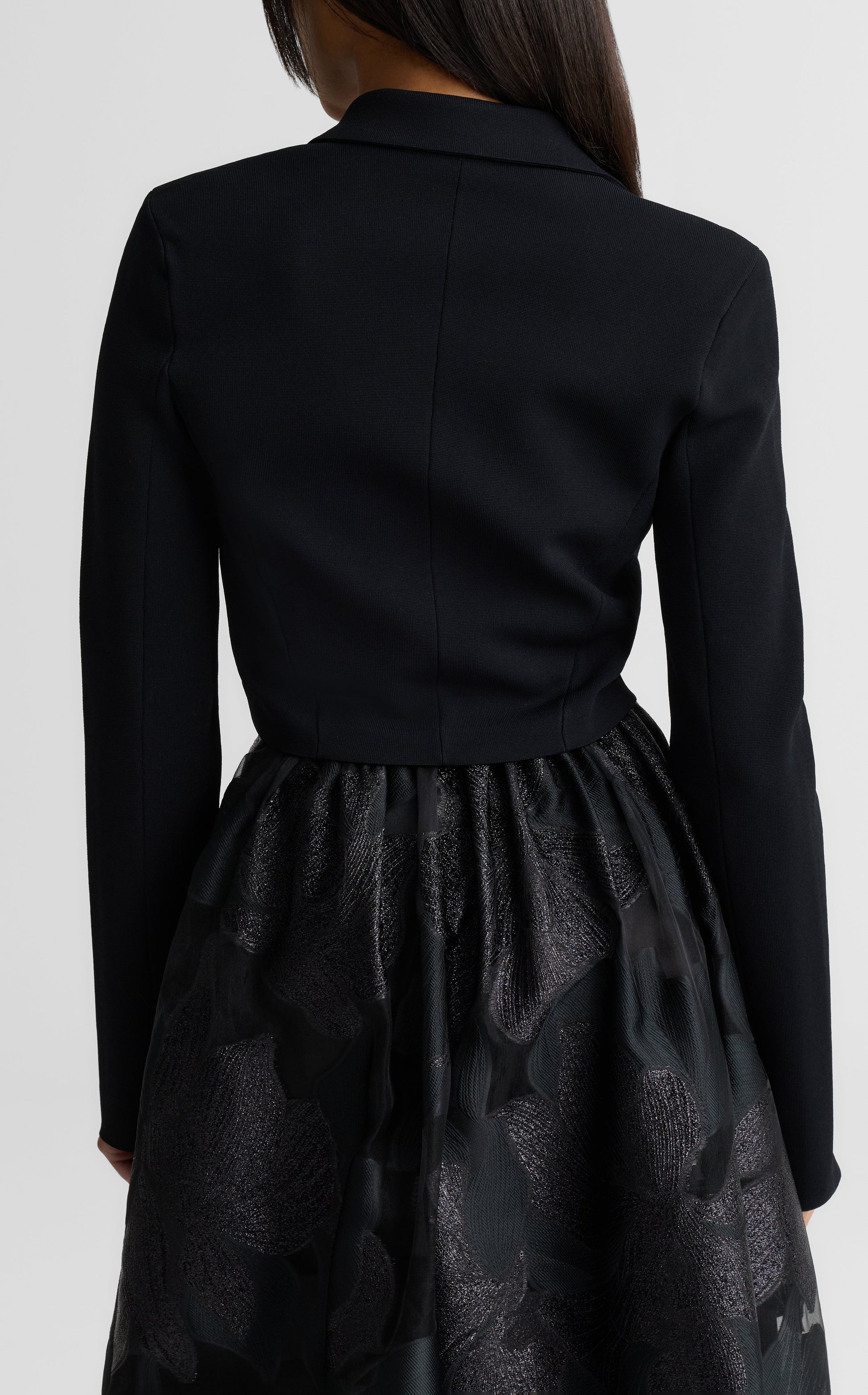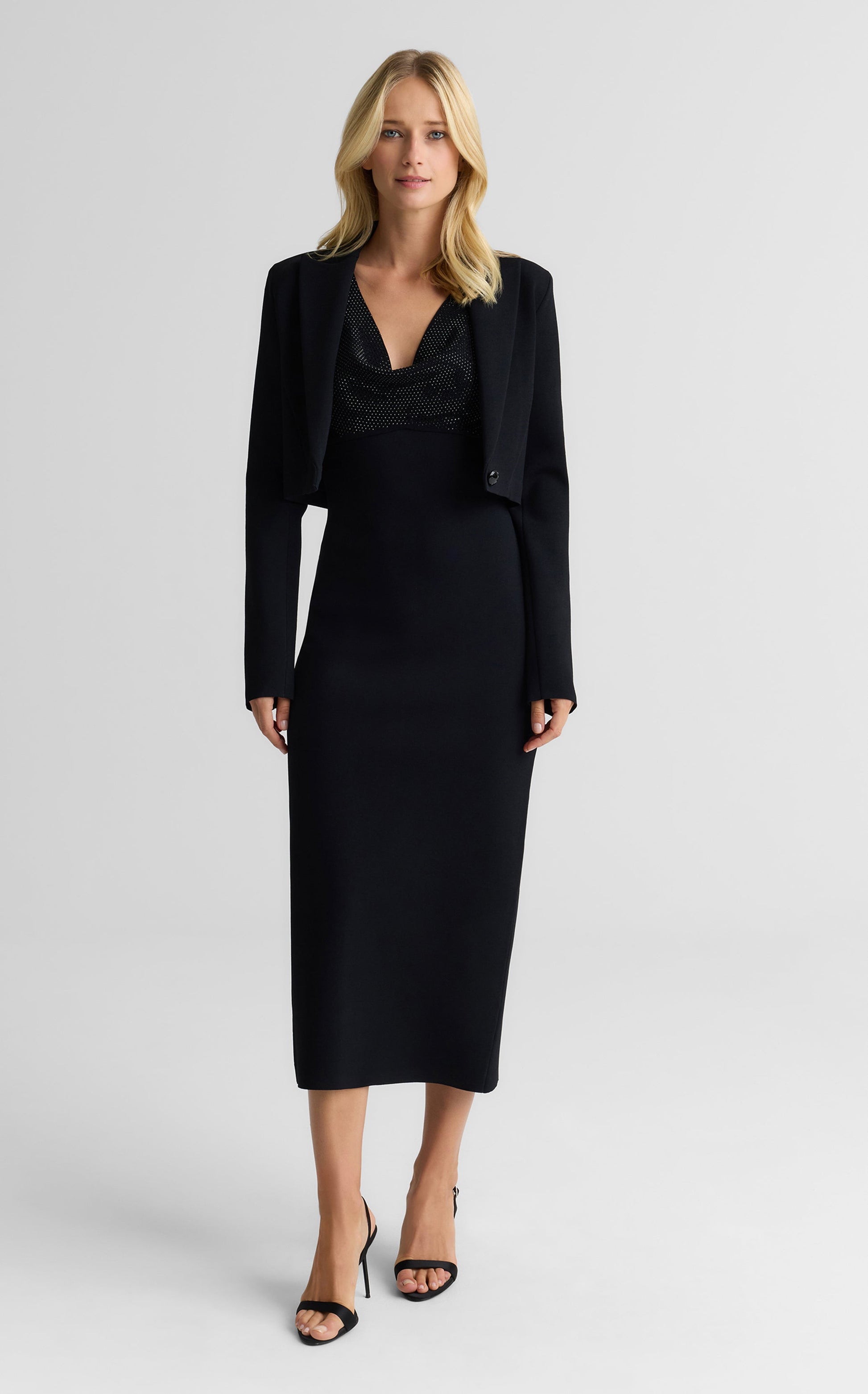 For a fresh twist on the classic tuxedo jacket, the Josie seamlessly pairs sophistication and ease, courtesy of our signature Santa Roma Knit. Its cropped silhouette finished with a vintage-inspired bespoke button creates a chic, modern layer to top off all your evening looks.