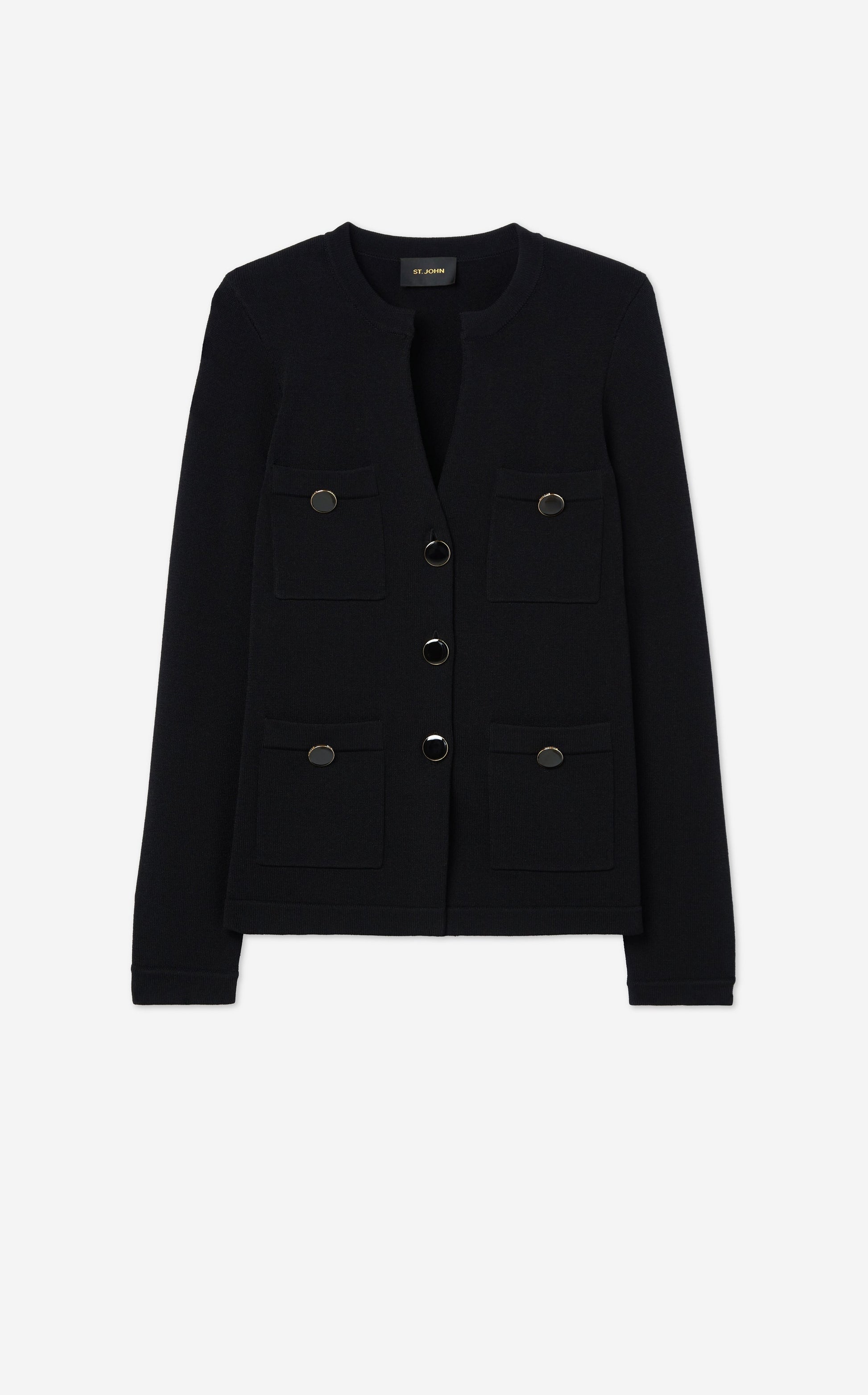 A modern neckline with an open V draws the eye to this chic Santiago Knit button front jacket, a luxurious knit that holds its shape through a lifetime of wear.