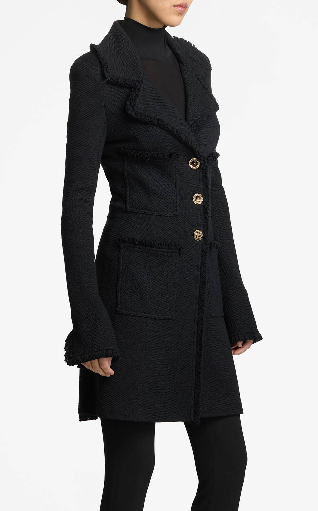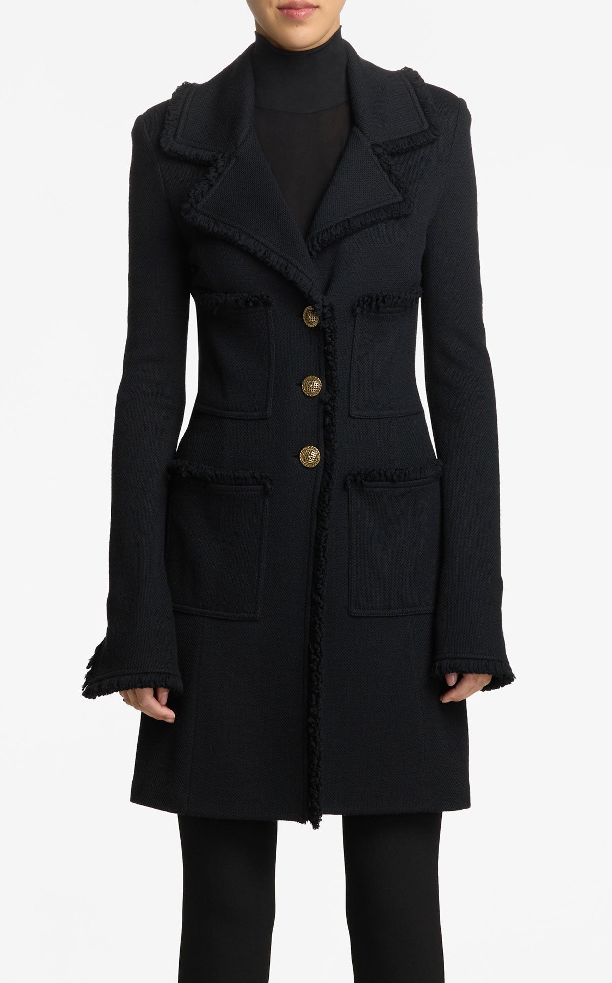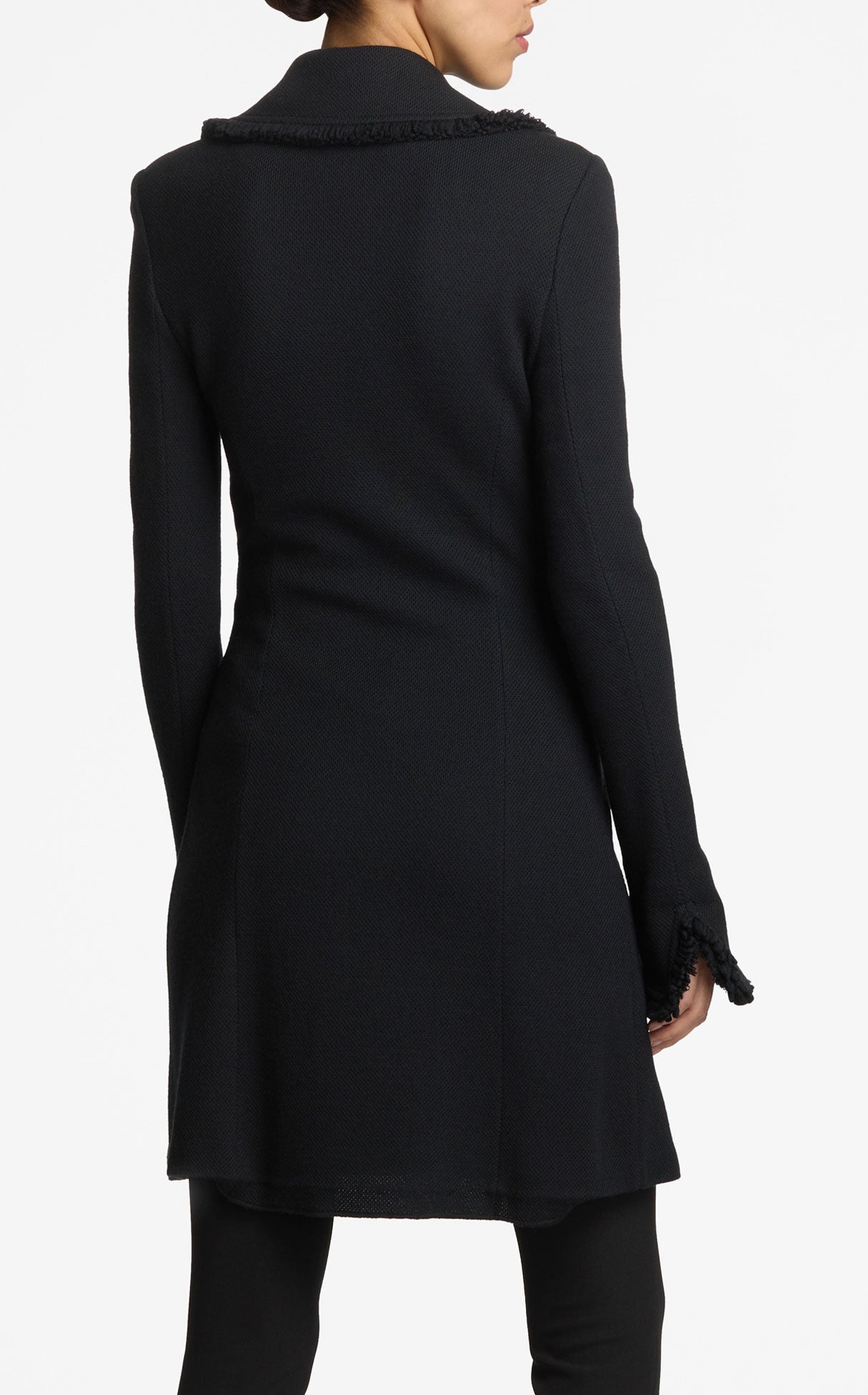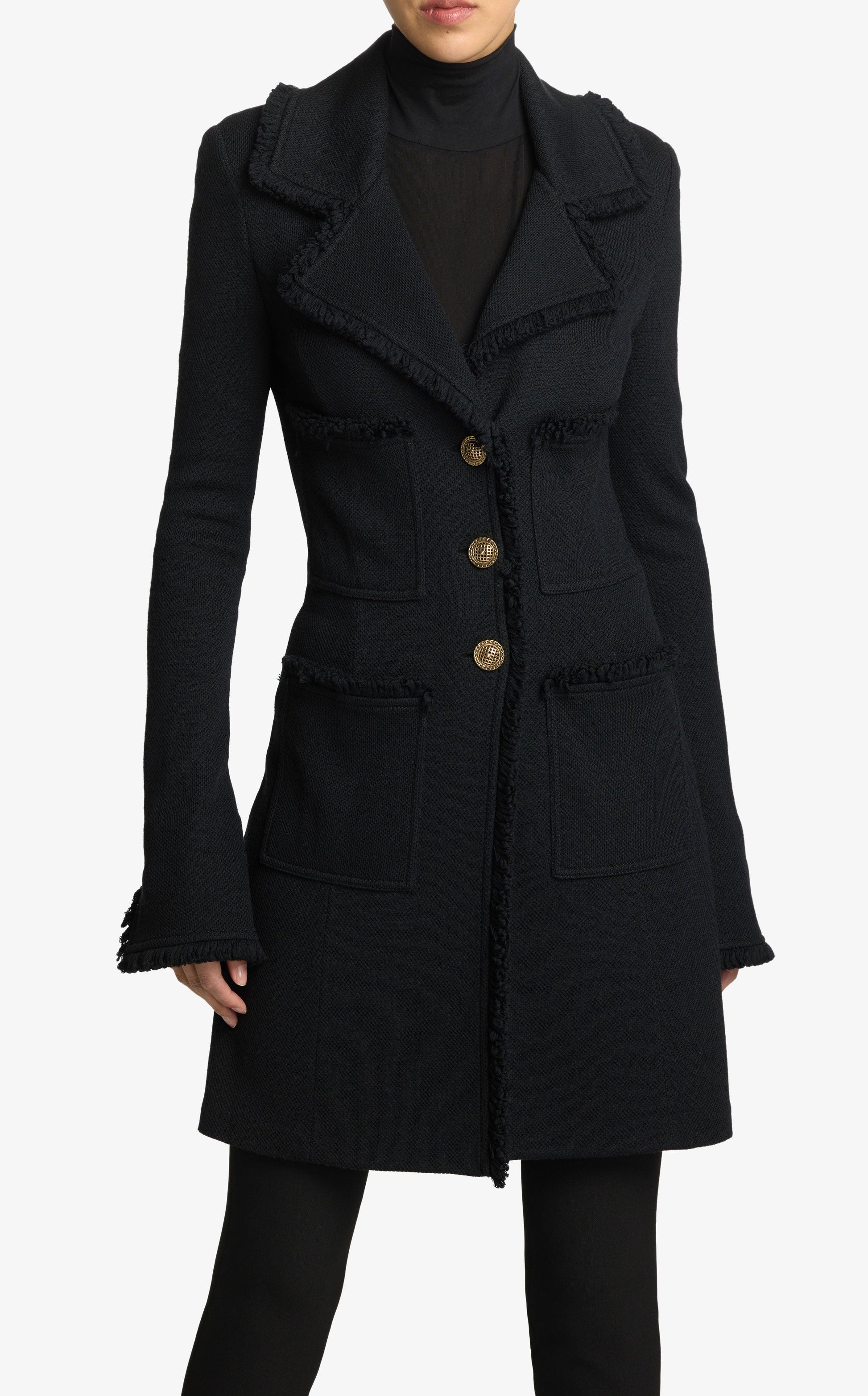 Make sleek your signature this season in this St. John Milano pique knit fit and flare topper. Tonal knit fringe trim, patch pockets, and a seductive sleeve slit imbues this elegant essential with stylish depth. Pair with a classic sheath and heels for office to evening glamour.