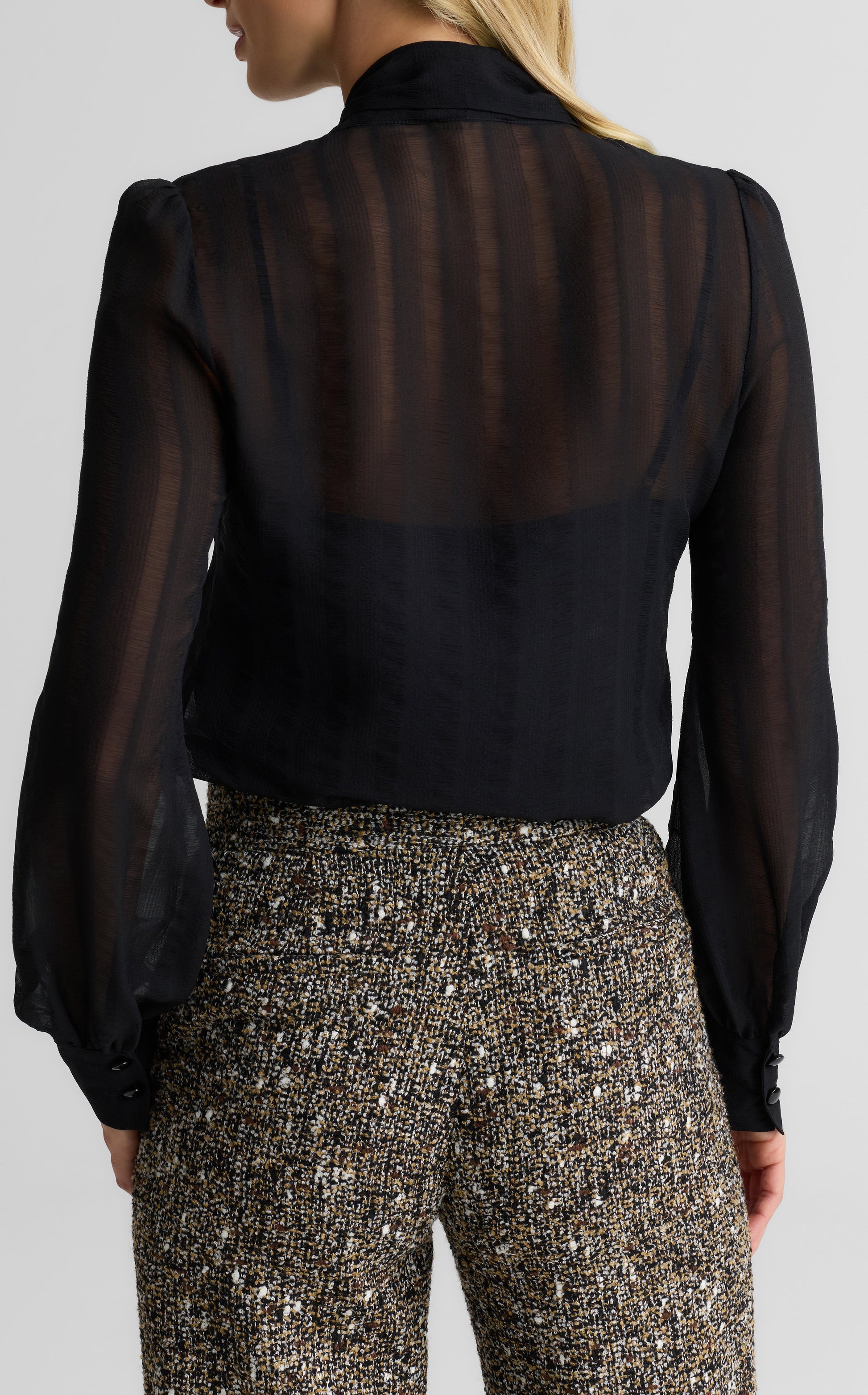 Taking its inspiration from ‘70s style icons, the Hannah balances elements of ease and polish for the utmost versatility. Crafted in airy Shadow Stripe Georgette, this tie-front blouse is statement-making with denim alone, but also seamlessly transitions to evening with voluminous ball gown skirts or tailored knit pants.