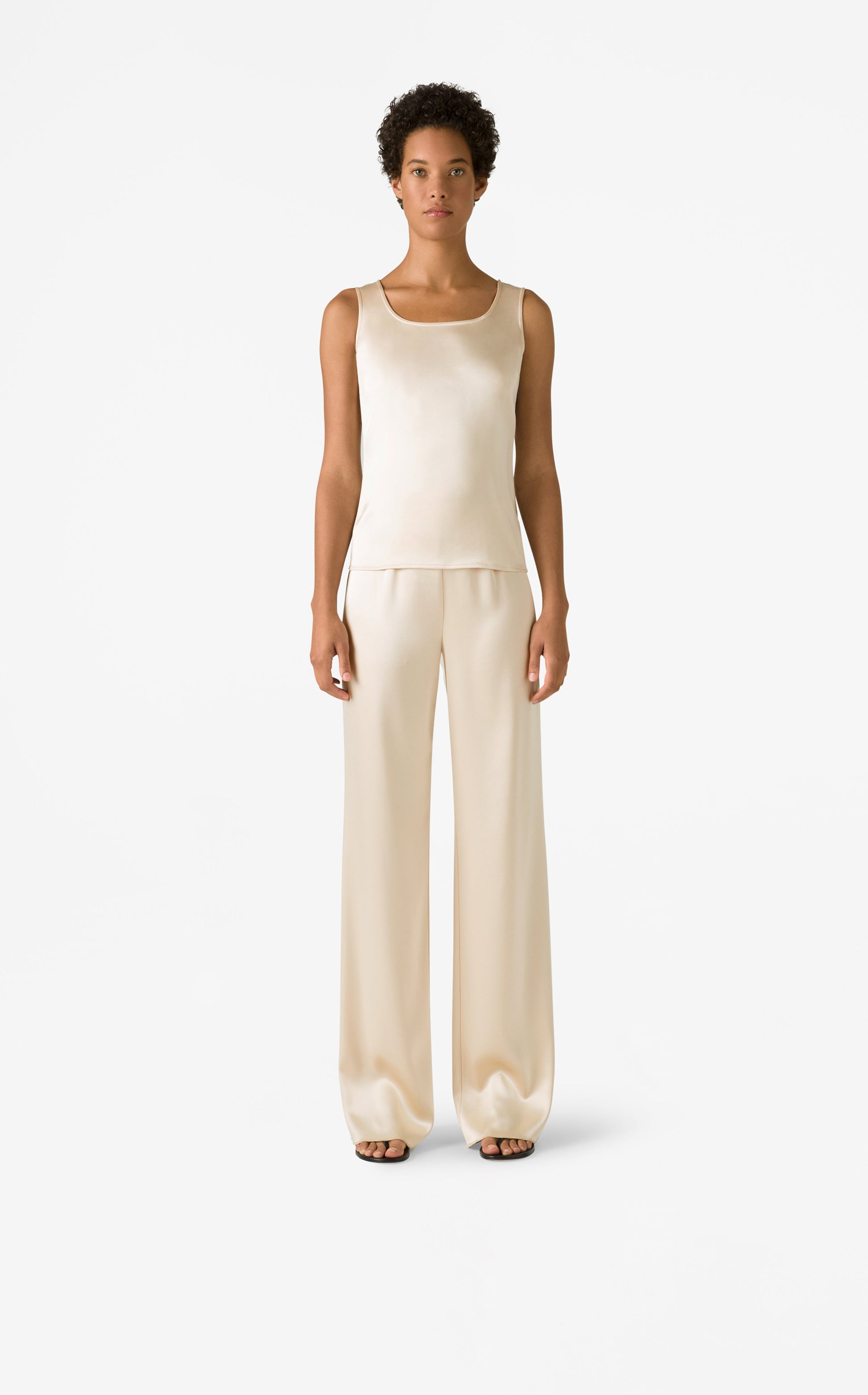 An exquisite choice for office to evening elegance, the liquid satin tank features a sleek silhouette and versatile ease. Whether paired with the St. John Liquid Satin Pant or a Skirt, this tank offers a polished finish.